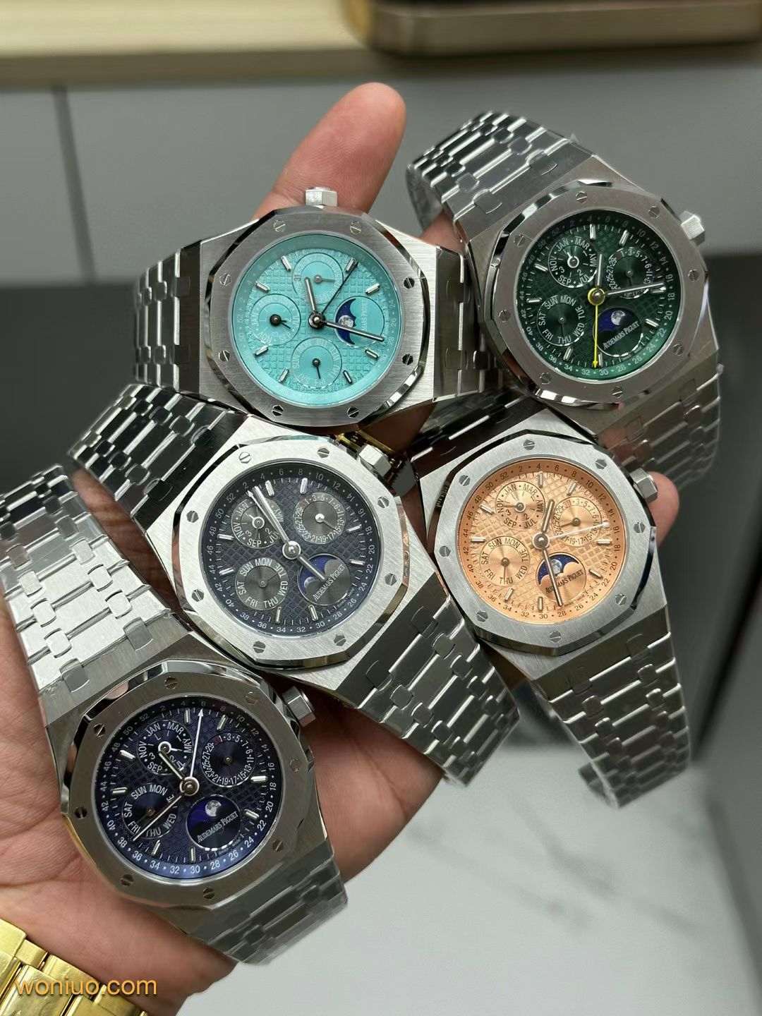 贵族钟錶 愛彼皇家橡樹系列萬年曆腕錶,高贵優雅的藍盤配上冷艷精鋼錶殼,完美體現愛彼美学設計及復雜功能的极高技術。
