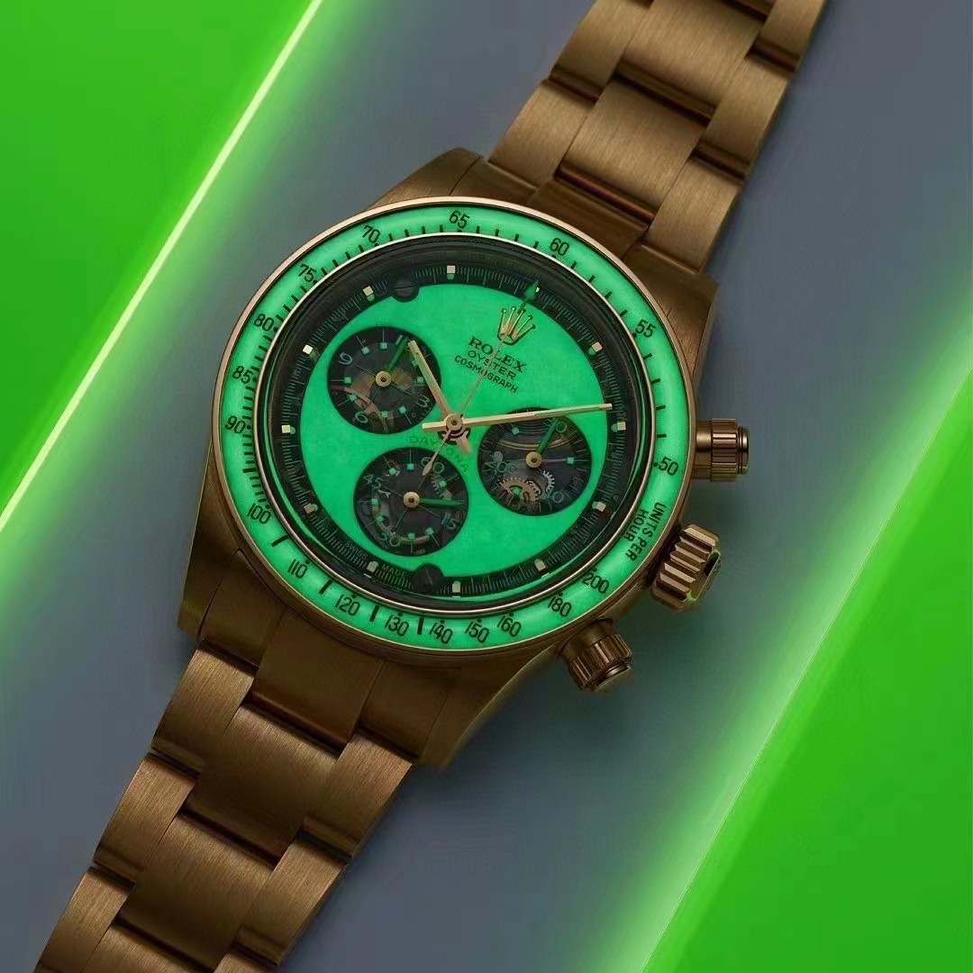 2、夜光材料凸顯了每一个細節——錶圈生動、獨特的色調与光滑錶面的魅力相映成趣。Super-Luminova 指針在錶盤上帶有 12 个霓虹灯参考點,营造出迷人的视覺张力。錶圈採用孤形藍寶石,辅以新開發的霓虹綠發光嵌件,唤起了过去時代的魅力。
