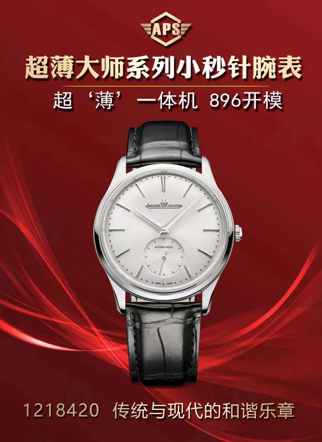 APS新品積家大師系列1218420,传统与現代的和谐乐章。Master Ultra Thin 超薄大師系列小秒針腕錶精鋼款搭配 8.1 毫米厚的精密錶殼(直徑 39 毫米),内載超薄丹東一體機896機芯。此自動上鍊機械機芯精准指示時、分、小秒。