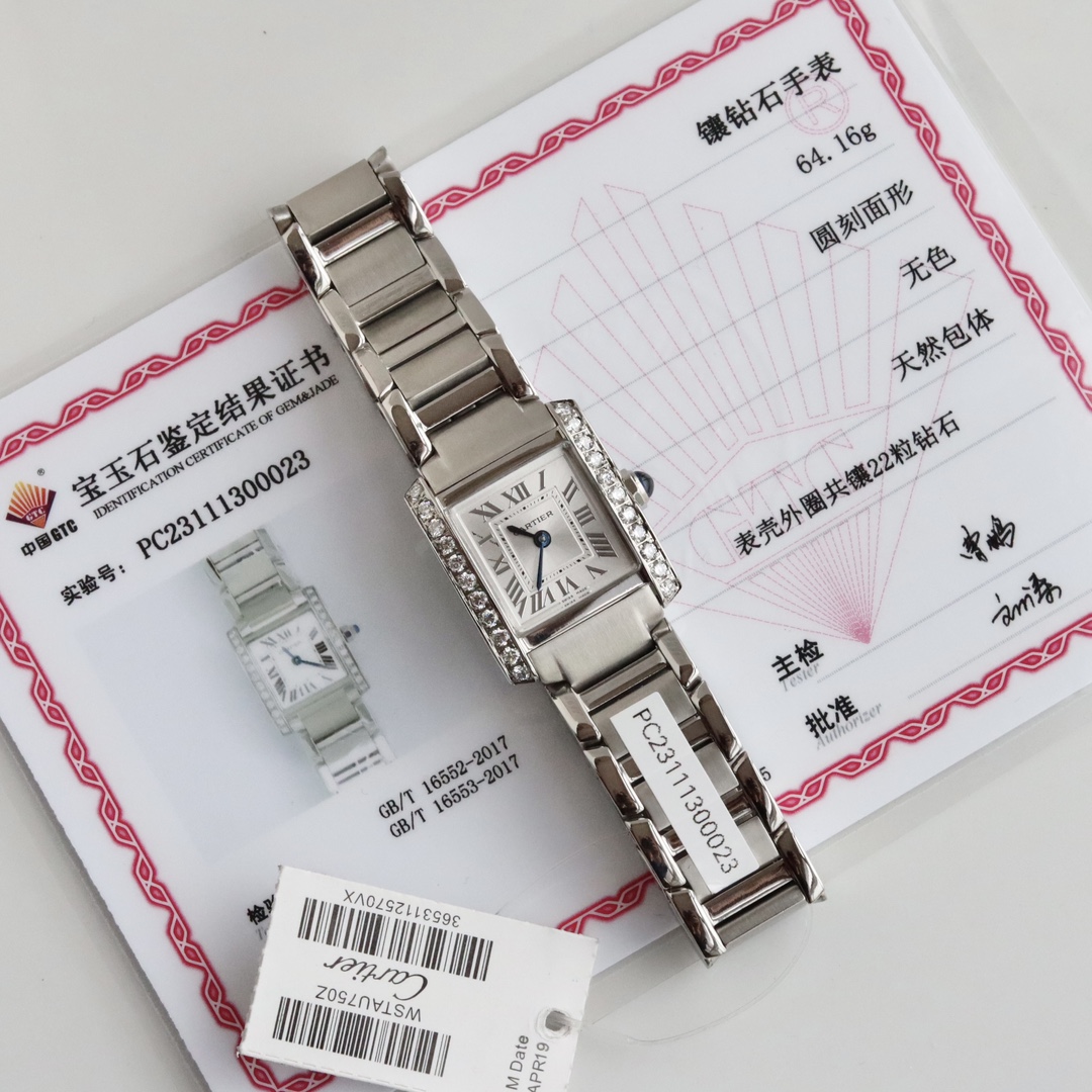最新推出2023年全网最新第2代TANK Francaise法国坦克真鑽 女士腕錶!錶殼镶嵌22颗2.1超大鑽石 约0.7克拉,配国检機構检测证书!一物一证一錶一码。錶盤尺寸小號25.7*21.2mm。 “一體手镯式”作為TANK系列的核心元素,第2代对錶殼、錶冠、錶鍊、錶盤設計細節均進行改進,整體風格更加現代!新作錶殼和錶鍊均採用進口316F精鋼打造。機芯採用瑞士進口石英機芯。錶殼尺寸比旧款略微增加,錶鍊鍊節比例也經过重新設計,均採用大面积的拉丝缎面工藝,錶殼和錶鍊浑然一體,极其连贯的线条,優雅利落!一體式鍊帶的鍊節採用“半跌式設計”非常柔软灵活且环环相扣,可以完美的贴合不同佩戴者的腕部! 平行錶耳搭配弧形錶殼,末端稍加圆角處理更顯圆润柔和。新作的巧妙和用心之處還在於:在錶殼给錶冠處挖出一个凹槽,讓錶冠可以半埋在殼中,形成一个錶冠的护肩,這樣既可以减輕錶冠顶手问题也讓视覺效果更為简约洗练!錶盤採用银白拉丝工藝,時標和分钟刻度均增加凹雕线条。新作比旧作升級了立體金屬時標,配以粹火烧鋼藍針,在高穿透法国藍寶石镜面映照下更加充满层次感和現代感!